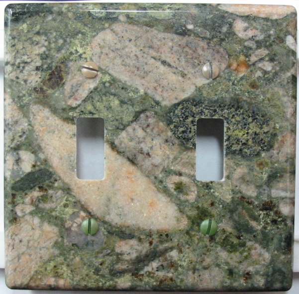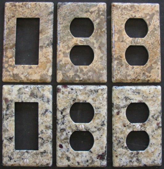 | Bordeaux granite switchplates and Gold travertine switchplates | Urango Gold and Santa Cecilia granite switch plate covers | This photo doesn't do this granite switch plate justice! |